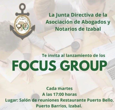En español «grupos de discusión» son un método de investigación de tipo cualitativo en el que la Asociación pretende reunir a un conjunto de abogados y notarios del departamento de Izaba para que participen dando sus opiniones, experiencias y posibles soluciones en procesos legales. Esperando lograr conseguir información y extraer los problemas legales latentes para poder gestionar ante las instituciones del departamento y diseñar una solución pertinente y posible para el gremio de abogados y notarios de Izabal.